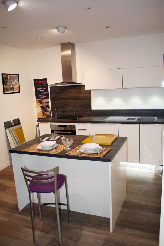 Ce modèle présenté avec un ilot central vous permettra de prendre vos repas et augmentera la capacité de rangement de votre cuisine.