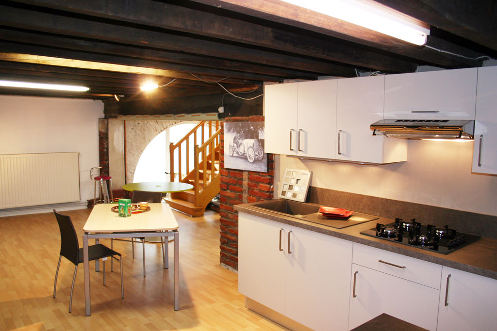 Table ronde assortie, crédence inox, hotte Candy, four Bosch, Lave-vaisselle encastré en hauteur dans demi colonne.